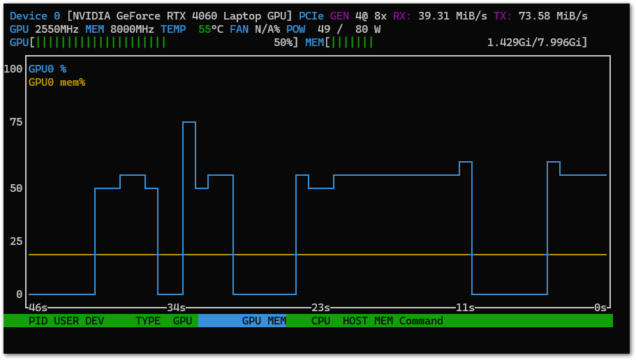 Beside nvidia-smi to check the card driver version I installed "nvtop" (which is part of Ubuntu) to see the GPU performance.